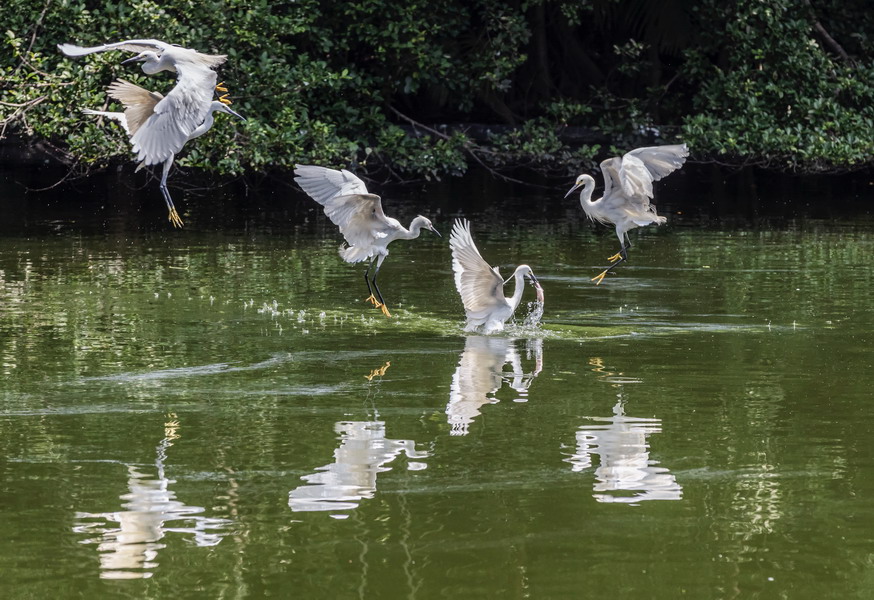 4月15日,攝于南山區(qū)華僑城天鵝堡附近。這是深圳拍鷺鳥的其中一個(gè)好去處。四只白鷺在水面上爭相捕食。徐捷攝