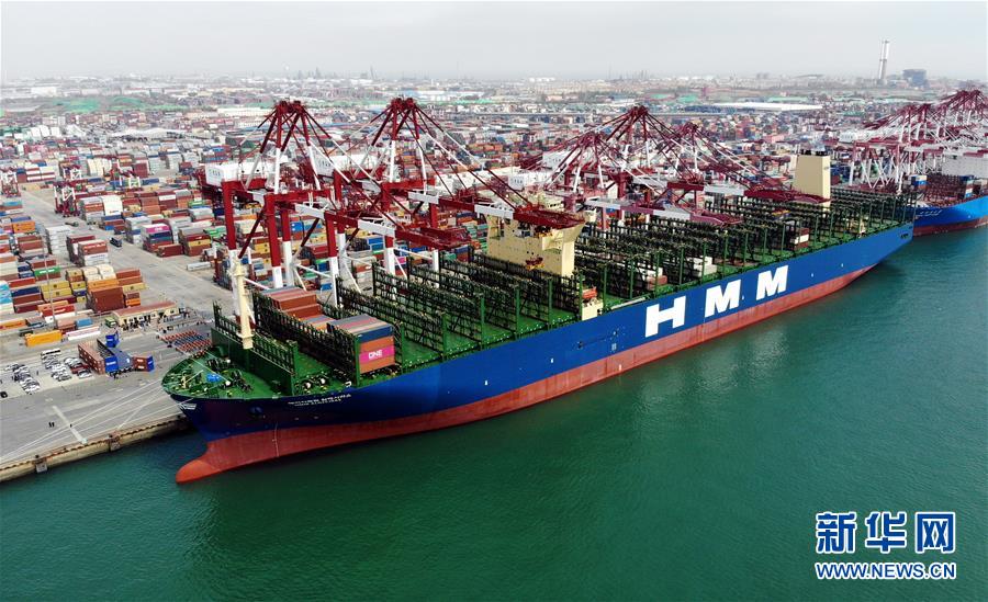 “現(xiàn)代商船阿爾赫西拉斯”輪靠泊在青島港前灣碼頭(無人機照片,4月26日攝)。當(dāng)日,載箱量可達2.4萬標(biāo)準(zhǔn)箱的世界最大集裝箱船“現(xiàn)代商船阿爾赫西拉斯”輪從山東青島港開啟首航,這條船的甲板面積超過2.4萬平方米,相當(dāng)于3.5個標(biāo)準(zhǔn)足球場大小。新華社記者李紫恒攝