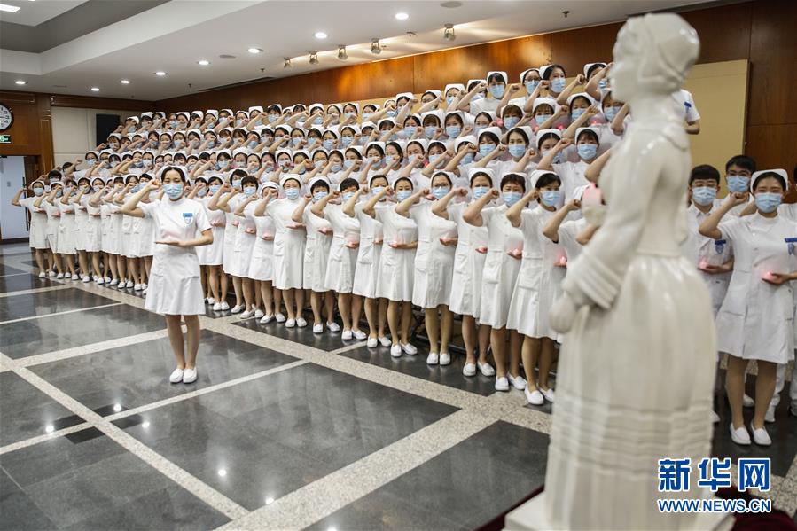 4月26日,北京大學人民醫(yī)院新入職護士參加授帽儀式時重溫南丁格爾誓言。當日,北京大學人民醫(yī)院為97名2019屆新入職護士舉行隆重莊嚴的授帽儀式和重溫南丁格爾誓言的活動,以此紀念南丁格爾誕辰200周年和即將到來的“國際護士節(jié)”。活動還邀請了5名援鄂國家醫(yī)療隊護士代表分享戰(zhàn)“疫”故事。新華社記者張玉薇攝