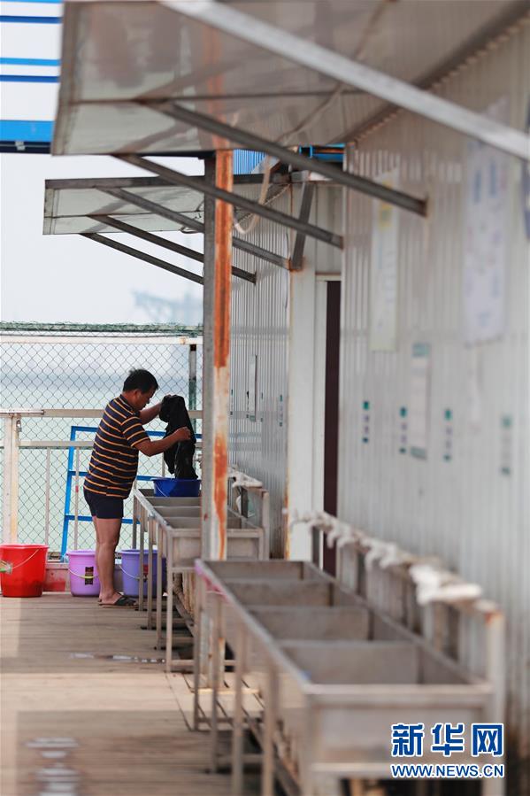 4月25日,一名工人在海上生活區(qū)洗衣服。新華社記者盧燁攝