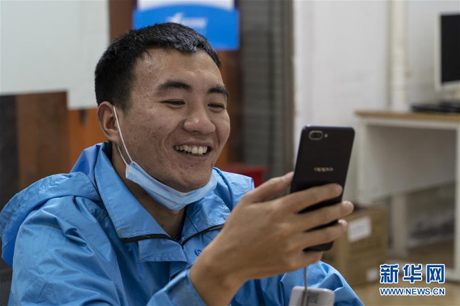 4月22日,在四川省成都市的一家外賣配送站點(diǎn),邱有哈子在與家人視頻聊天。新華社記者 李夢馨 攝