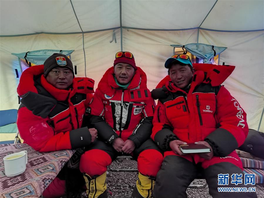 5月7日,在海拔6500米的珠峰前進營地,測量登山隊隊長次洛(中)與旺青索朗(左)、魯達(右)在協調會議現場。新華社特約記者扎西次仁攝