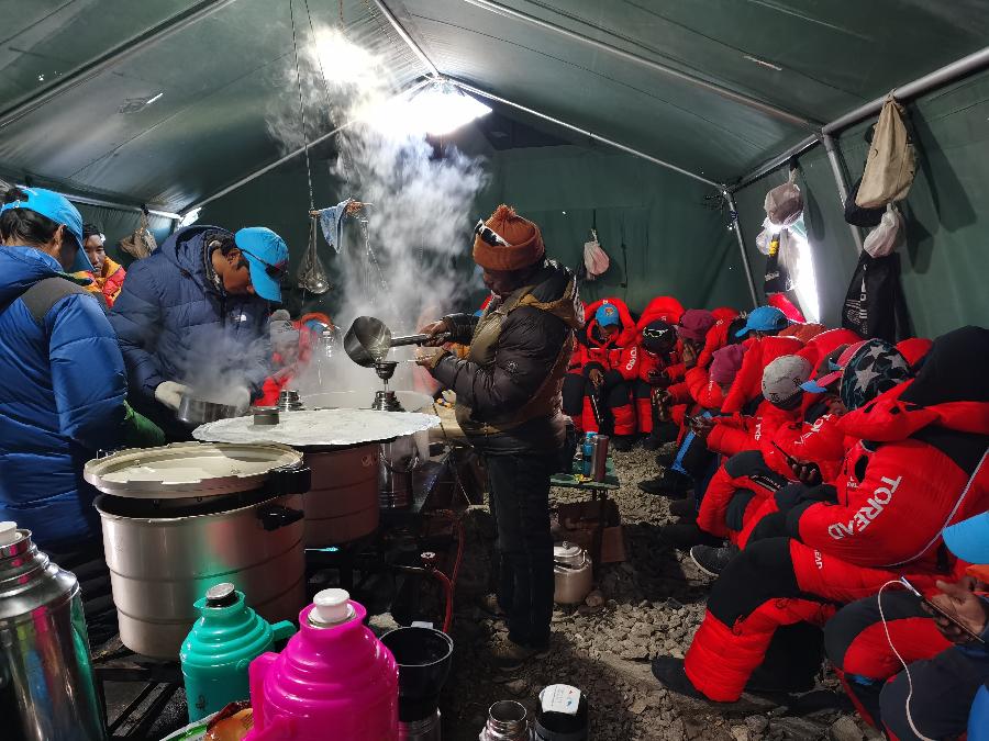 在海拔6500米的珠峰前進營地召開的前方工作協調會(5月7日攝)。新華社特約記者邊巴攝