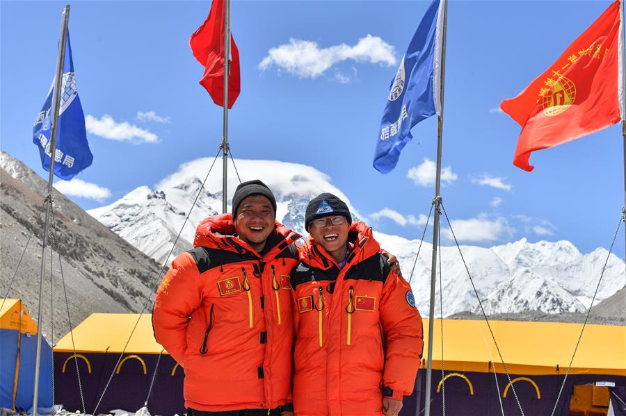 參與2020珠峰高程測量任務(wù)的國測一大隊(duì)隊(duì)員鄭林(左)與武光偉在珠峰大本營(5月8日攝)。5月8日是世界微笑日。在海拔5200米的珠峰大本營,參與2020珠峰高程測量的各方人員,微笑期待本次測量活動(dòng)的圓滿成功。新華社記者晉美多吉攝