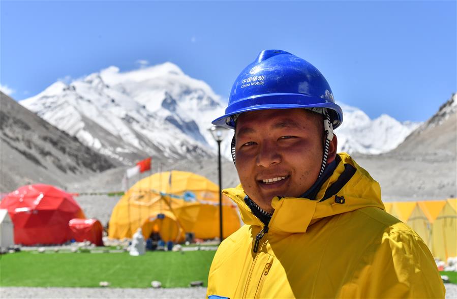 中國移動西藏公司員工土旦頓桑在珠峰大本營(5月8日攝)。5月8日是世界微笑日。在海拔5200米的珠峰大本營,參與2020珠峰高程測量的各方人員,微笑期待本次測量活動的圓滿成功。