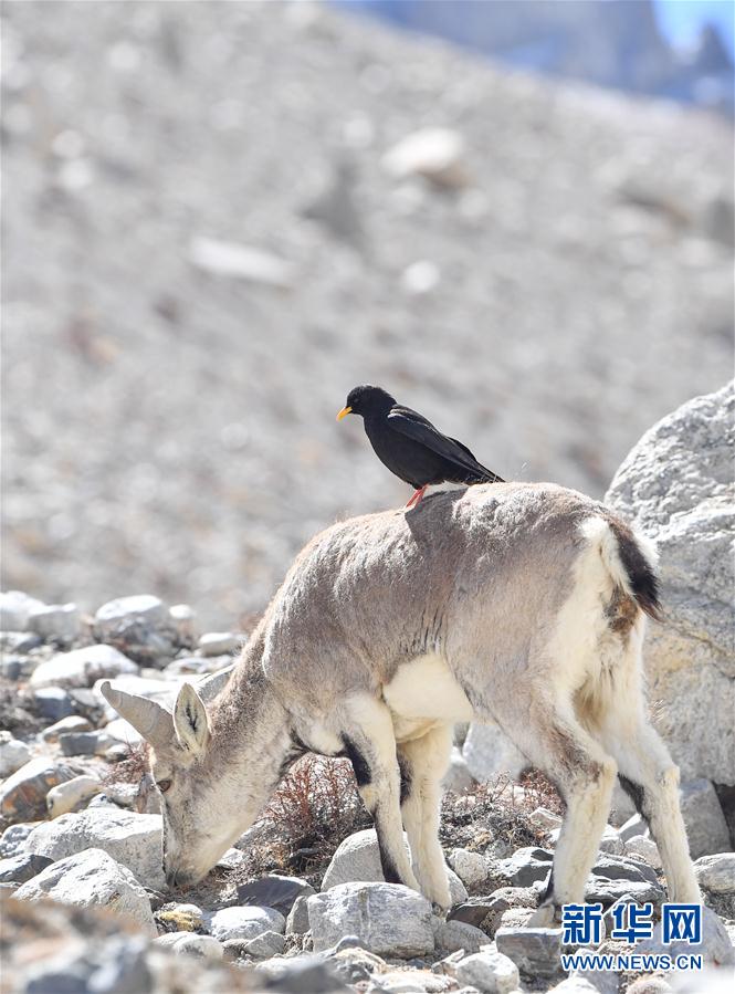 一只黃嘴山鴉停留在巖羊身上(5月8日攝)。當日,一群巖羊在珠峰大本營周圍覓食,黃嘴山鴉飛到巖羊身上停留,構(gòu)成一幅幅生動有趣的雪域圖畫。新華社記者晉美多吉攝