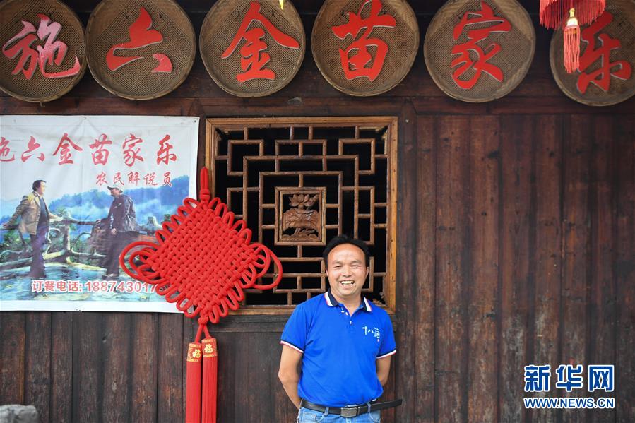 這是施六金在他的農(nóng)家樂(lè)前留影(4月25日攝)。1973年出生于十八洞村的施六金,由于父親患病很早就放棄學(xué)業(yè)和母親扛起了家庭的重?fù)?dān)。為了生活,他還曾遠(yuǎn)去東南亞打工。2015年,看到家鄉(xiāng)的變化,施六金回到村里開(kāi)起了農(nóng)家樂(lè),年度家庭人均純收入也從2014年的1715元增長(zhǎng)到了2019年的35696元。2018年,施六金與心愛(ài)的人組建了家庭。今年初,施六金與愛(ài)人迎來(lái)了一個(gè)大胖小子?!白鋈俗鍪乱没貓?bào)和感恩。”施六金給剛出生的兒子取名施澤恩。新華社記者薛宇舸攝
