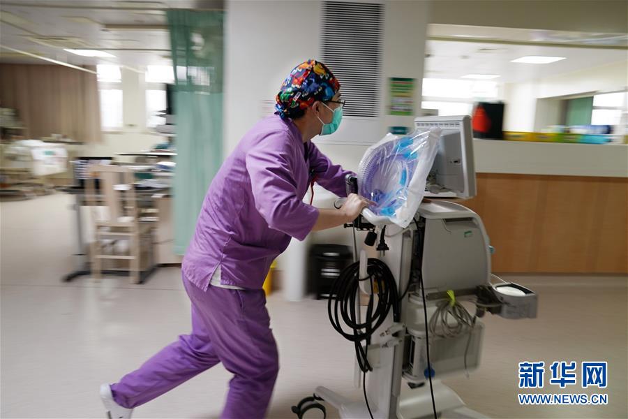 5月10日,在上海市普陀區(qū)中心醫(yī)院內(nèi)科重癥監(jiān)護室,護士來文健在推運設(shè)備。新華社記者劉穎攝