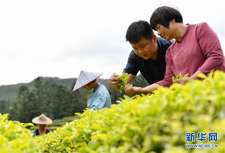 方舟跟著母親游玉瓊(右)學(xué)習(xí)采摘武夷巖茶中的白雞冠品種(5月10日攝)。新華社記者魏培全攝