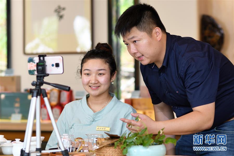 方舟(右)在指導(dǎo)公司員工使用電商平臺直播銷售武夷巖茶(5月10日攝)。新華社記者魏培全攝
