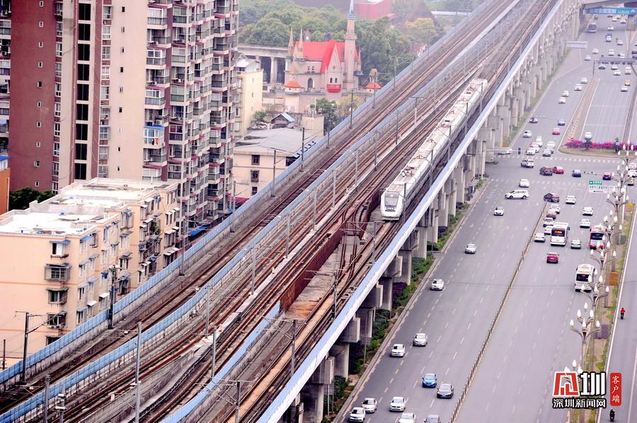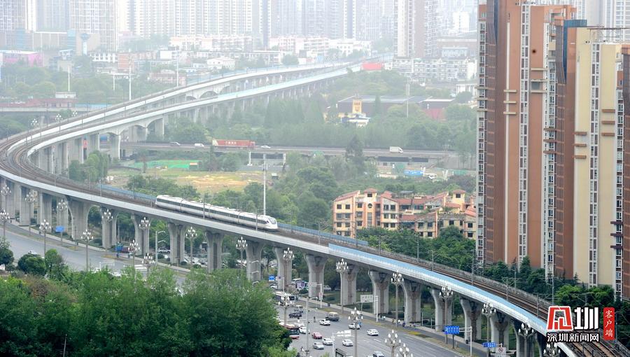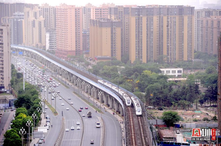 2020年5月11日,四川省成都市,動(dòng)車運(yùn)行在成灌鐵路上。隨著發(fā)展,鐵路沿線已是高樓林立。