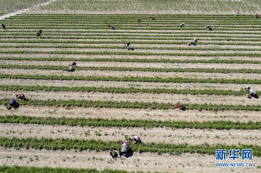 5月11日,采茶工在寧夏百瑞源賀蘭山基地采摘枸杞芽茶(無人機照片)。當(dāng)日,寧夏百瑞源賀蘭山基地枸杞芽茶全面進入采摘季。據(jù)了解,該基地茶園面積300余畝,助力附近200多名農(nóng)民就業(yè)增收。新華社記者楊植森攝