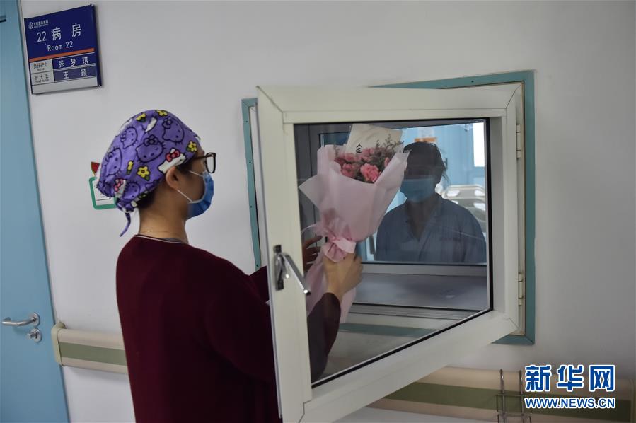 5月11日,在北京地壇醫(yī)院感染二科病房外,一名護(hù)士向病人轉(zhuǎn)交病人女兒送來(lái)的鮮花。北京地壇醫(yī)院是北京市收治新冠肺炎患者的定點(diǎn)醫(yī)院之一,醫(yī)院的醫(yī)護(hù)人員一直奮戰(zhàn)在抗擊疫情的一線(xiàn)。在國(guó)際護(hù)士節(jié)前夕,記者前往北京地壇醫(yī)院,記錄下抗疫一線(xiàn)護(hù)士的日常工作狀態(tài)。新華社記者彭子洋攝