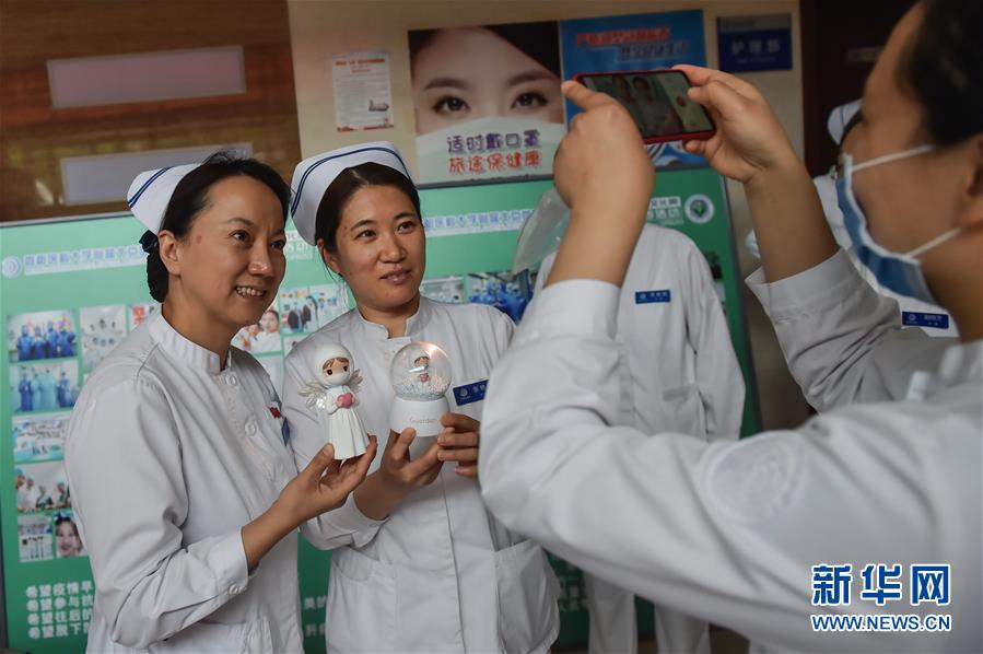 5月11日,在北京地壇醫(yī)院感染二科護(hù)士站,護(hù)士們被在護(hù)士節(jié)收到的禮物——天使玩偶所吸引。北京地壇醫(yī)院是北京市收治新冠肺炎患者的定點(diǎn)醫(yī)院之一,醫(yī)院的醫(yī)護(hù)人員一直奮戰(zhàn)在抗擊疫情的一線(xiàn)。在國(guó)際護(hù)士節(jié)前夕,記者前往北京地壇醫(yī)院,記錄下抗疫一線(xiàn)護(hù)士的日常工作狀態(tài)。新華社記者彭子洋攝