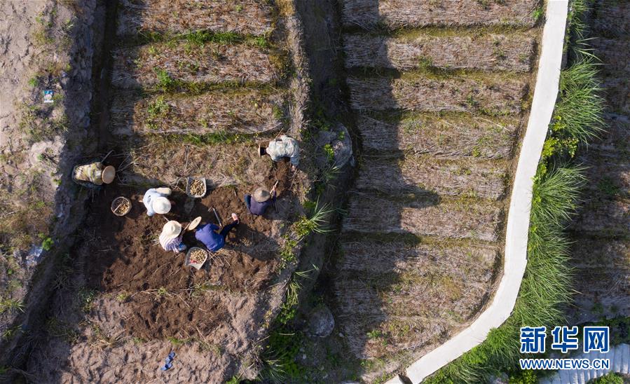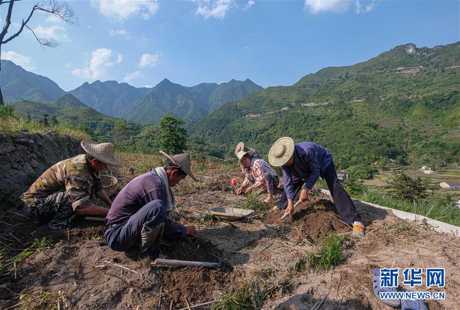 5月12日,青田縣巨浦鄉(xiāng)西坑村的村民在梯田收獲中藥貝母。當(dāng)?shù)夭扇『献魃缂懈N,冬春種中藥、夏秋種養(yǎng)水稻和田魚的方式,全面提升土地利用率和收益。新華社記者徐昱攝