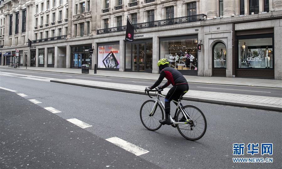 5月12日,在英國倫敦,一名男子騎行經過攝政街關閉的店鋪。新華社記者韓巖攝