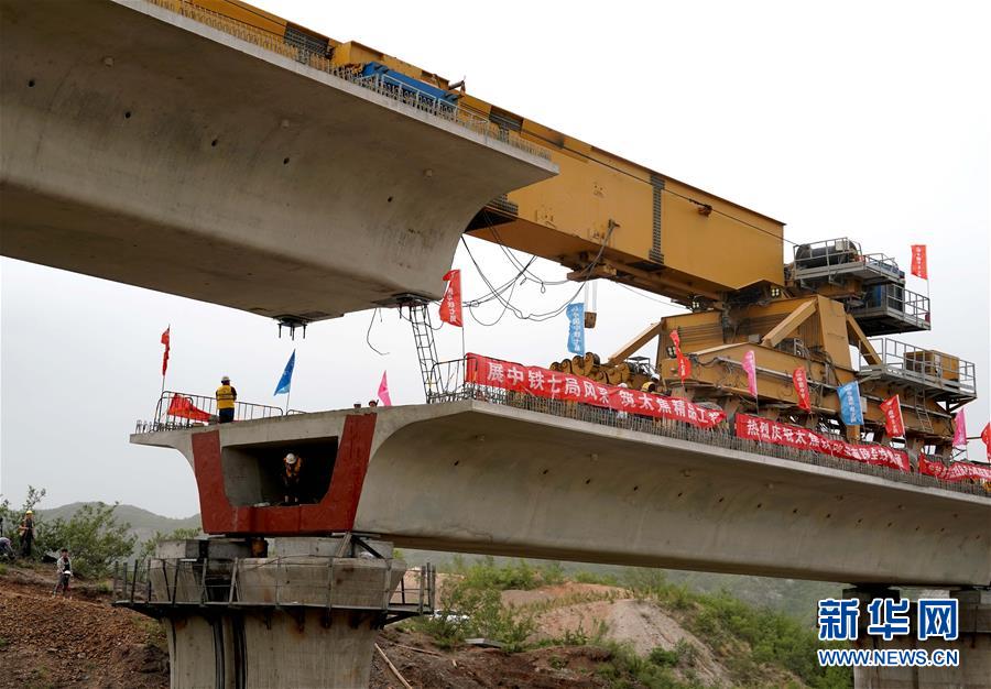 5月13日,中鐵七局的工作人員在位于河南焦作的施工現(xiàn)場指揮架梁作業(yè)。 當(dāng)日,隨著最后一榀長24米、重552噸的箱梁架設(shè)就位,太焦高鐵全線橋梁架設(shè)完成。從山西太原到河南焦作的太焦高鐵是國家規(guī)劃建設(shè)的“八縱八橫”高速鐵路網(wǎng)的重要組成部分,計劃2020年底建成通車。 新華社記者李安攝