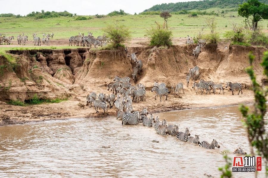 最終,一只勇敢的斑馬帶頭率先跳入河中。