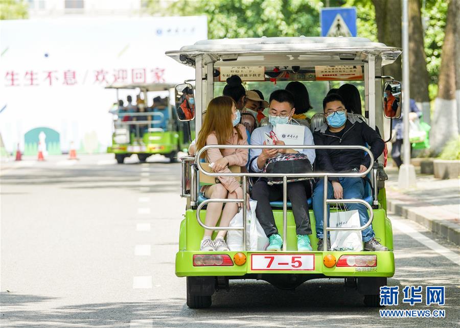 5月15日,在西南大學(xué)校園內(nèi),學(xué)生們搭乘校內(nèi)轉(zhuǎn)運(yùn)車(chē)前往各自的宿舍。當(dāng)日,重慶西南大學(xué)迎來(lái)疫情以來(lái)首批返校大學(xué)生。據(jù)介紹,按照疫情防控的需要,重慶市高校2020年春季學(xué)期從5月11日起按照“一校一策”原則,實(shí)行錯(cuò)峰錯(cuò)時(shí)分批次有序開(kāi)學(xué)復(fù)課。新華社記者劉潺攝