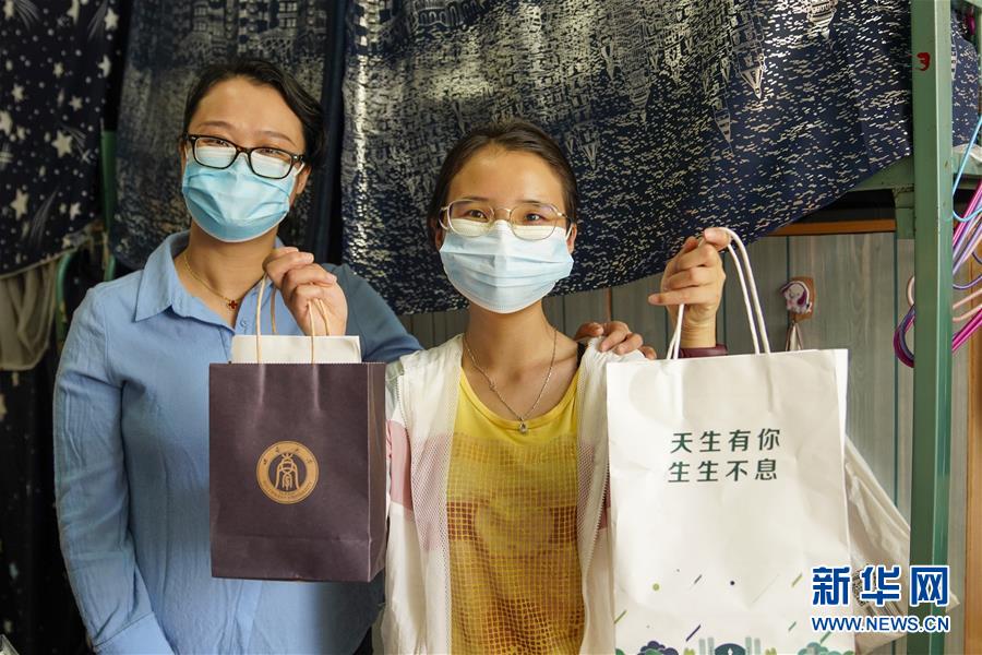 5月15日,在西南大學(xué)女生宿舍內(nèi),一名學(xué)生(右)展示學(xué)校和學(xué)院送來(lái)的裝有口罩、防疫指南的紙袋。當(dāng)日,重慶西南大學(xué)迎來(lái)疫情以來(lái)首批返校大學(xué)生。據(jù)介紹,按照疫情防控的需要,重慶市高校2020年春季學(xué)期從5月11日起按照“一校一策”原則,實(shí)行錯(cuò)峰錯(cuò)時(shí)分批次有序開(kāi)學(xué)復(fù)課。新華社記者劉潺攝