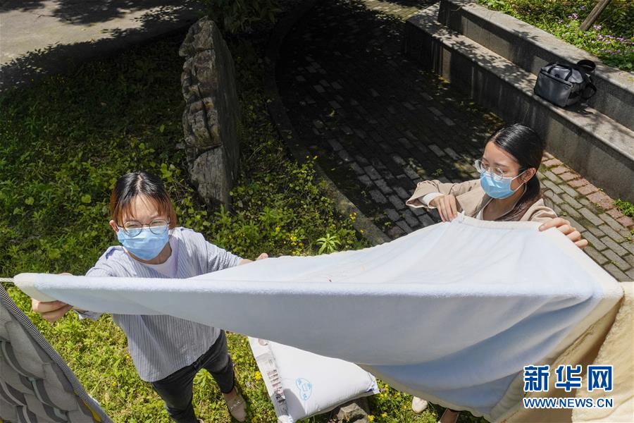5月15日,在西南大學(xué)一棟宿舍樓下,一名返校大學(xué)生(左)在輔導(dǎo)員老師的幫助下曬被子。當(dāng)日,重慶西南大學(xué)迎來(lái)疫情以來(lái)首批返校大學(xué)生。據(jù)介紹,按照疫情防控的需要,重慶市高校2020年春季學(xué)期從5月11日起按照“一校一策”原則,實(shí)行錯(cuò)峰錯(cuò)時(shí)分批次有序開(kāi)學(xué)復(fù)課。新華社記者劉潺攝