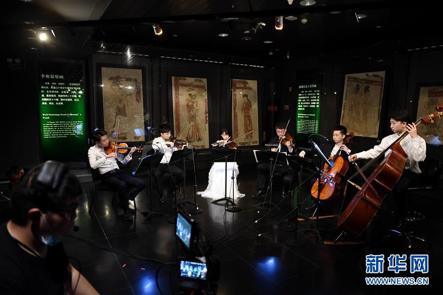 在陜西歷史博物館唐代壁畫(huà)珍品館,西安交響樂(lè)團(tuán)小提琴首席周虎翼、第二小提琴首席白東旭、第二小提琴演奏員葉姣睿、中提琴演奏員時(shí)少愷、大提琴演奏員于丁和低音提琴演奏員趙子杰(從左至右)為“云上國(guó)寶”音樂(lè)會(huì)彩排(5月14日攝)。為迎接國(guó)際博物館日,5月14日,西安交響樂(lè)團(tuán)走進(jìn)陜西歷史博物館唐代壁畫(huà)珍品館,為5月18日的“云上國(guó)寶”音樂(lè)會(huì)彩排。觀眾將通過(guò)網(wǎng)絡(luò)直播,在聆聽(tīng)天籟的同時(shí)欣賞國(guó)之瑰寶,感受藝術(shù)與美的和諧共鳴。新華社記者李一博攝