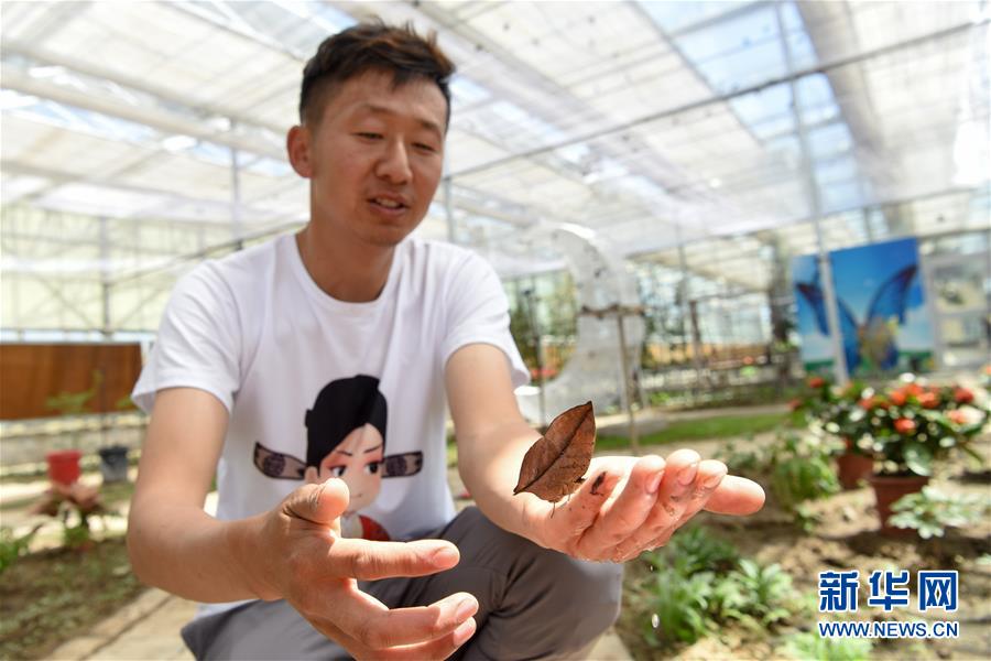 在吉木薩爾縣七彩蝶園,關(guān)富云向游客介紹養(yǎng)殖的枯葉蝶(5月15日攝)。新華社記者丁磊攝