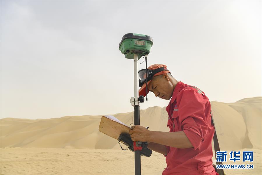 在新疆尉犁至且末沙漠公路施工現(xiàn)場(chǎng),測(cè)繪員劉耀軍在沙山旁測(cè)量并標(biāo)注施工線(xiàn)(5月17日攝)。新華社記者胡虎虎攝