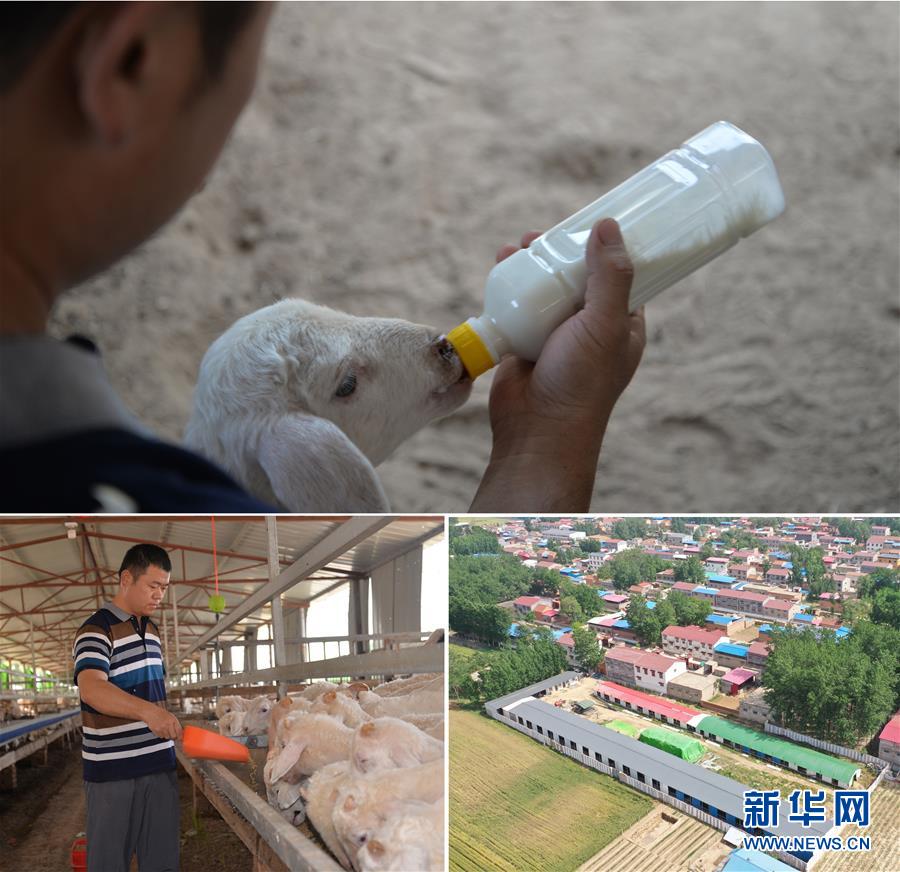 這是一張拼版照片(圖片均為5月16日攝)。上圖:在河南省開(kāi)封市尉氏縣大橋鄉(xiāng)崗劉村,34歲的丁懿軍在給小羊喂奶;下左圖:丁懿軍在給羊喂食;下右圖:在扶貧政策扶持下,丁懿軍在村頭建了占地8畝的羊養(yǎng)殖場(chǎng),現(xiàn)養(yǎng)羊800多只(無(wú)人機(jī)照片)。新華社記者孫清清攝