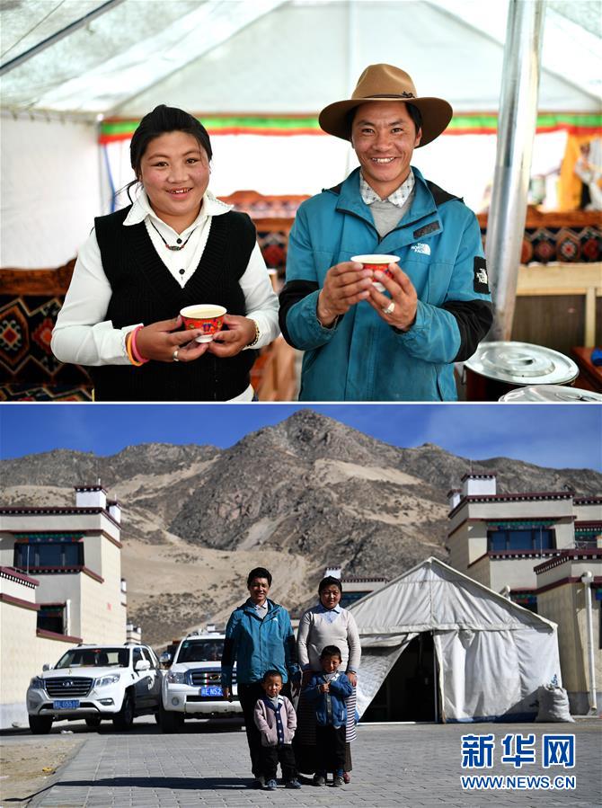 拼版照片上圖:在森布日極高海拔地區(qū)生態(tài)搬遷安置點,格多(右)和妻子洛巴在展示自家打的酥油茶;下圖:在森布日極高海拔地區(qū)生態(tài)搬遷安置點,格多(后左)和妻子洛巴及大兒子扎西尼瑪(前右)、小兒子普巴多杰在帳篷茶館前合影(照片均攝于4月15日)。格多的老家在西藏那曲市安多縣色務(wù)鄉(xiāng),一個藏北偏遠的牧區(qū)。2019年底,政府對平均海拔4500米以上的那曲市安多縣、雙湖縣進行極高海拔地區(qū)生態(tài)搬遷。和格多一家一樣,安多縣、雙湖縣搬遷下來的4000余名群眾完成了人生的遷徙,開啟了更加美好的生活。黨的十八大以來,我們堅持以人民為中心的發(fā)展思想,明確了到2020年我國現(xiàn)行標(biāo)準(zhǔn)下農(nóng)村貧困人口實現(xiàn)脫貧、貧困縣全部摘帽、解決區(qū)域性整體貧困的目標(biāo)任務(wù)。目前看,脫貧進度符合預(yù)期,成就舉世矚目。這些成績的取得,凝聚了全黨全國各族人民智慧和心血,是廣大干部群眾扎扎實實干出來的。脫貧摘帽不是終點,而是新生活、新奮斗的起點。新華社記者詹彥攝
