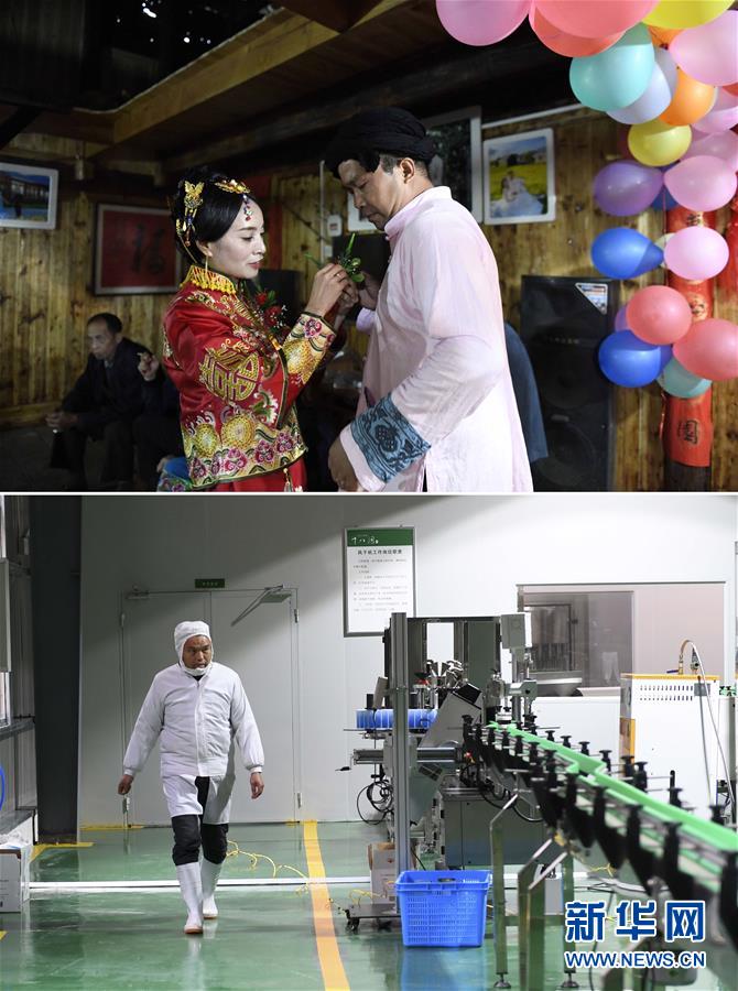 拼版照片上圖:婚禮開(kāi)始前,吳春霞(左)為施六金佩戴胸花(2018年9月24日攝);下圖:施六金在十八洞村新建的山泉水廠里工作(2018年2月3日攝)。地處武陵山腹地的湖南湘西土家族苗族自治州花垣縣十八洞村曾深陷貧困。2013年,村里225戶中有136戶是貧困戶,40歲以上的“光棍兒”有30多人。2014年以來(lái),十八洞村逐漸蛻變。2016年初,結(jié)束外出打工的施六金返鄉(xiāng)辦起“苗家樂(lè)”。2017年,村里的十八洞村山泉水廠正式建成投產(chǎn),他受聘成為廠里的技術(shù)工人,每月都有固定工資。隨著日子越過(guò)越好,許多像施六金這樣摘了窮帽的大齡“光棍兒”收獲了愛(ài)情,實(shí)現(xiàn)了安居樂(lè)業(yè),事業(yè)愛(ài)情雙豐收。黨的十八大以來(lái),我們堅(jiān)持以人民為中心的發(fā)展思想,明確了到2020年我國(guó)現(xiàn)行標(biāo)準(zhǔn)下農(nóng)村貧困人口實(shí)現(xiàn)脫貧、貧困縣全部摘帽、解決區(qū)域性整體貧困的目標(biāo)任務(wù)。目前看,脫貧進(jìn)度符合預(yù)期,成就舉世矚目。這些成績(jī)的取得,凝聚了全黨全國(guó)各族人民智慧和心血,是廣大干部群眾扎扎實(shí)實(shí)干出來(lái)的。脫貧摘帽不是終點(diǎn),而是新生活、新奮斗的起點(diǎn)。新華社記者李尕?cái)z