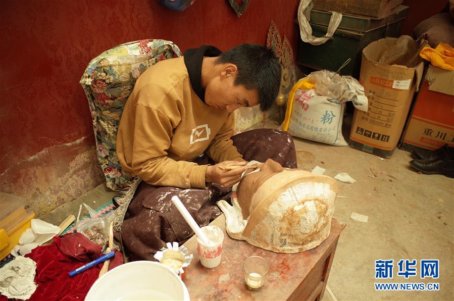 在西藏拉薩市達孜區(qū),西洛的學(xué)徒旦增扎西在給面具塑形(5月15日攝)。新華社記者格桑邊覺攝