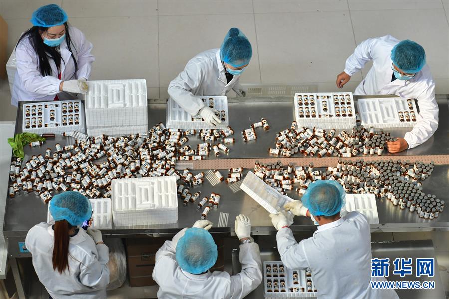 宋家溝村村民在食品加工廠包裝沙棘飲料(5月10日攝)。新華社記者曹陽攝