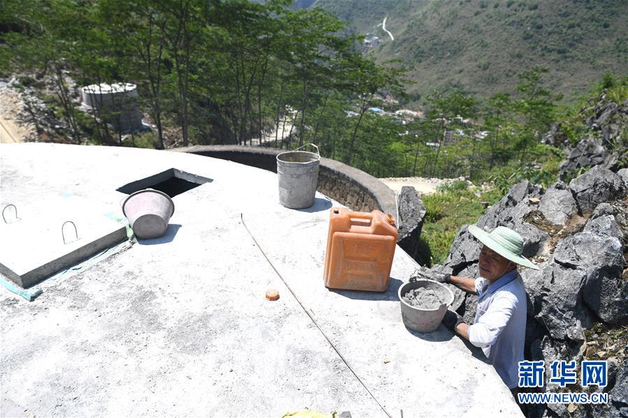 大化瑤族自治縣弄合村弄根屯一位村民在建水柜(5月14日攝,無人機照片)。新華社記者周華攝