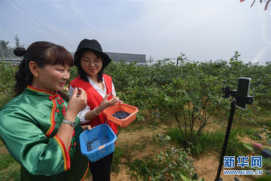 5月20日,長興縣林城鎮(zhèn)上獅村的藍莓種植幫扶基地內,青年志愿者與種植戶通過手機直播藍莓的采摘,并介紹當地藍莓生長環(huán)境和品質,進行網上銷售。新華社記者徐昱攝
