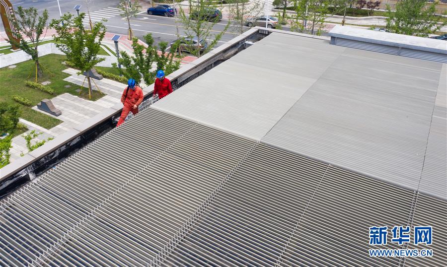 5月21日,工作人員在巡查“城市客廳”屋頂光伏設(shè)備并網(wǎng)情況(無(wú)人機(jī)照片)。新華社記者徐昱攝