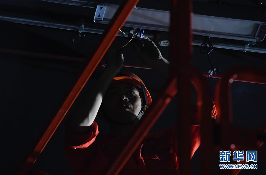 5月23日,工人在海口文明東越江通道項(xiàng)目隧道內(nèi)安裝照明設(shè)備。新華社記者楊冠宇攝