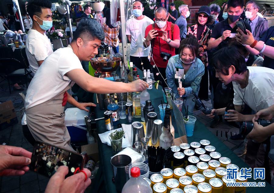 5月24日,調(diào)酒師在上海思南公館露天夜市進行網(wǎng)絡(luò)直播。入夏以來,上海思南公館推出“思南夜派對”夜間經(jīng)濟大排檔,包括生活市集、深夜食堂、夜游露天博物館等板塊,匯集了國潮品牌、創(chuàng)意美食、藝術(shù)衍生品等攤位,為公眾帶來一站式夜間休閑“加油站”,促進夜間消費。新華社記者陳飛攝