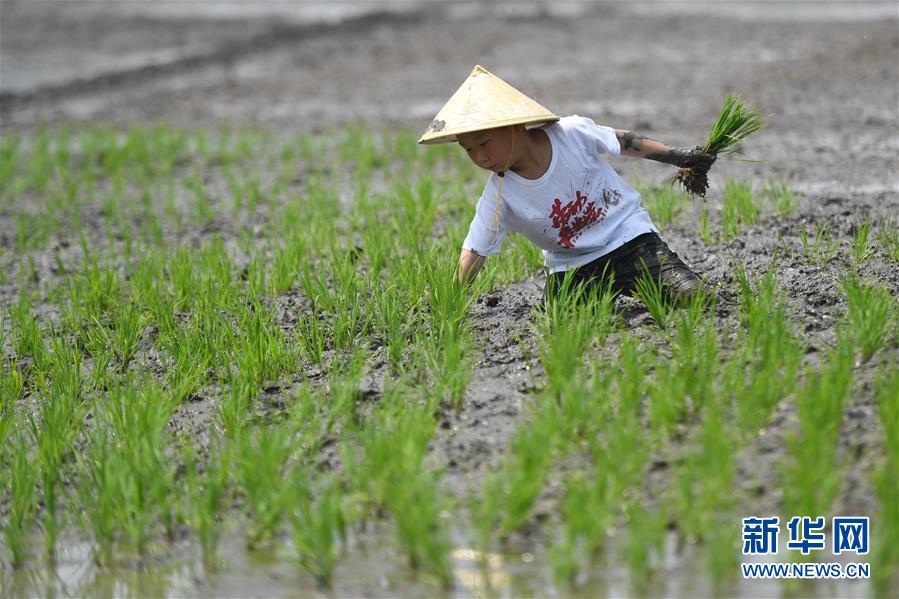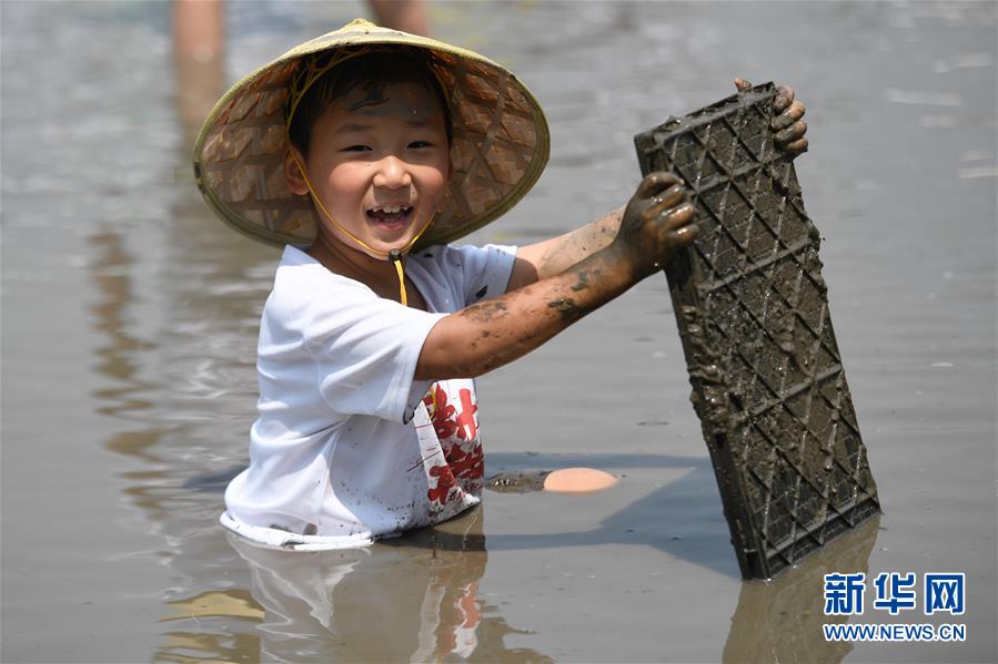 5月24日,一名小朋友在稻田里插秧。當(dāng)日,十余名小朋友在家長(zhǎng)的帶領(lǐng)下來(lái)到浙江省湖州市吳興區(qū)八里店鎮(zhèn)尹家圩糧油植保農(nóng)機(jī)專業(yè)合作社的稻田中,參加親子插秧、稻田捉魚(yú)等農(nóng)事體驗(yàn)活動(dòng)。新華社記者黃宗治攝