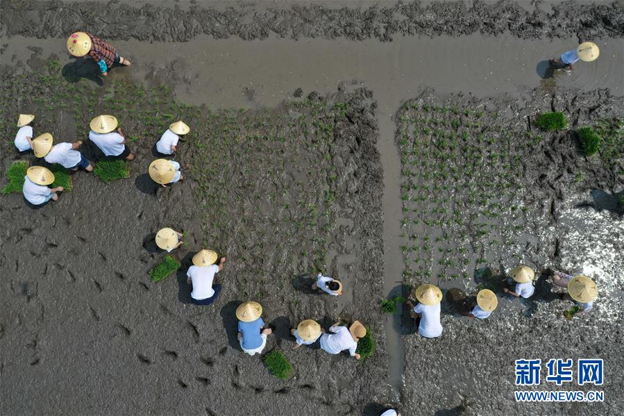 5月24日,小朋友與家長(zhǎng)在稻田里參加親子插秧比賽。當(dāng)日,十余名小朋友在家長(zhǎng)的帶領(lǐng)下來(lái)到浙江省湖州市吳興區(qū)八里店鎮(zhèn)尹家圩糧油植保農(nóng)機(jī)專業(yè)合作社的稻田中,參加親子插秧、稻田捉魚(yú)等農(nóng)事體驗(yàn)活動(dòng)。新華社記者黃宗治攝