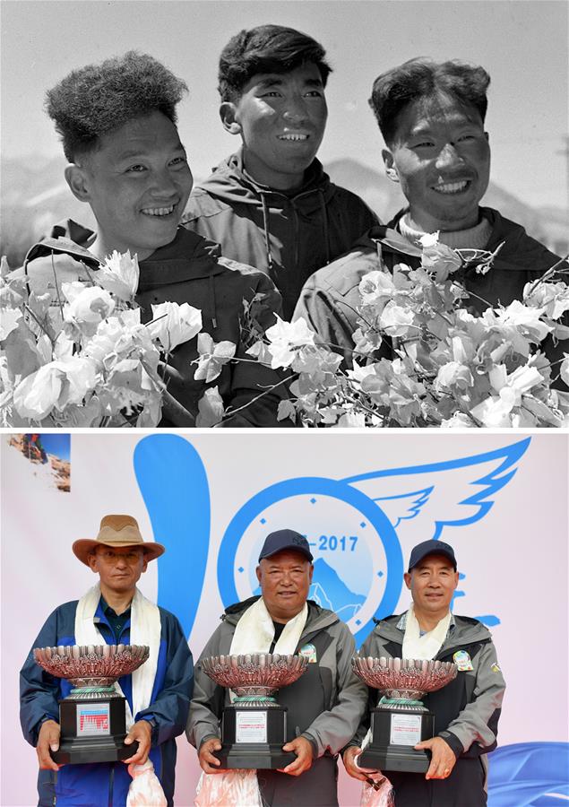 拼版照片:上圖為1960年6月7日,人類歷史上首次從北坡登頂珠峰的中國(guó)登山隊(duì)隊(duì)員王富洲(右)、貢布(中)與屈銀華三人凱旋拉薩后捧花合影(資料照片)。新華社發(fā)下圖為2017年7月12日,在紀(jì)念西藏登山隊(duì)成功登頂世界14座海拔8000米以上高峰10周年儀式上,隊(duì)員次仁多吉(中)、邊巴扎西(左)和洛則獲頒紀(jì)念獎(jiǎng)杯。新華社記者普布扎西攝