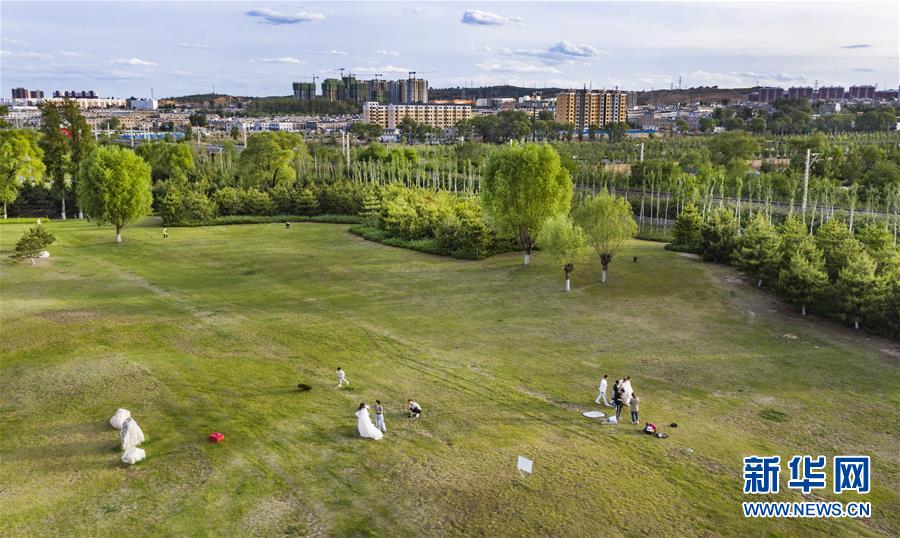 5月24日,市民在榆林市城市綠化帶拍攝婚紗照(無(wú)人機(jī)照片)。新華社記者陶明攝