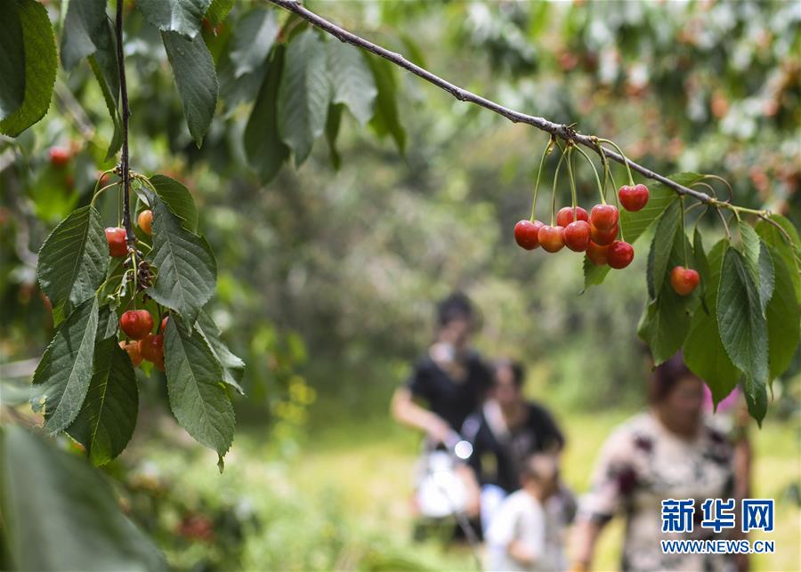 5月25日,在新疆莎車縣米夏鎮(zhèn)夏馬勒巴格村,游客在櫻桃采摘園里觀光。新華社記者王菲攝