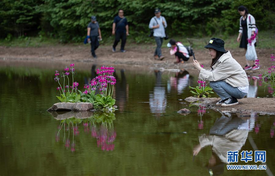 5月24日,在四川省漢源縣桌子山,一名游客在水邊拍報春花。