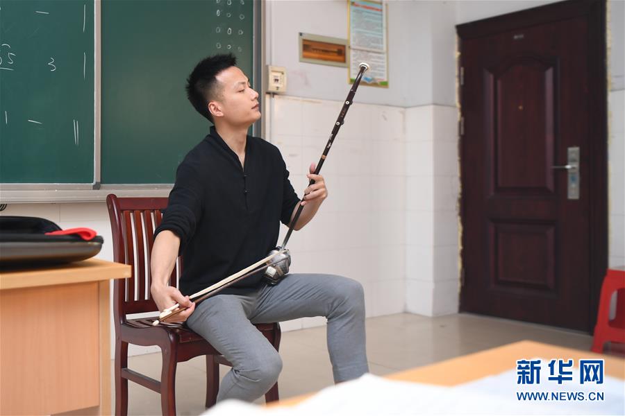 在湖南省湘西土家族苗族自治州,戴發(fā)在瀘溪縣第五中學教室內(nèi)演奏二胡(5月22日攝)。新華社記者薛宇舸攝