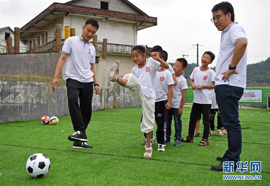 5月27日,在江西省貴溪市金屯鎮(zhèn)金屯村渡坊村小組,志愿者和留守兒童一起進行體育活動。新華社記者萬象攝