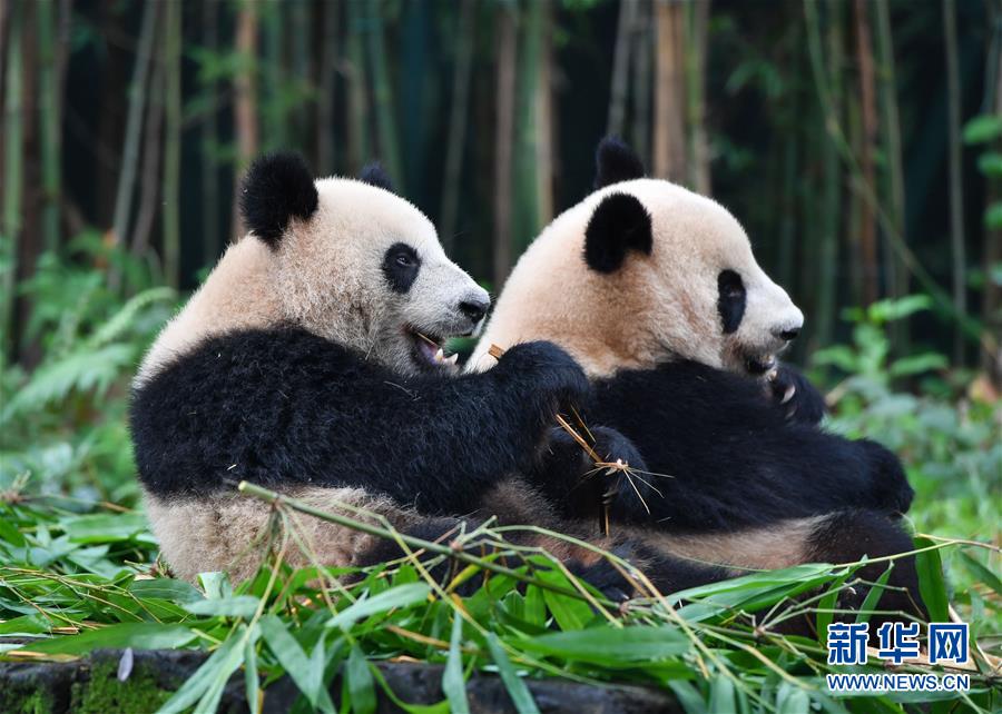 5月27日,大熊貓婷仔和隆仔在享受竹子大餐。正在享受竹子大餐的廣州長(zhǎng)隆野生動(dòng)物世界大熊貓婷仔被大熊貓隆仔搶食,兩只大熊貓上演一場(chǎng)爭(zhēng)食戲碼。新華社記者劉大偉攝