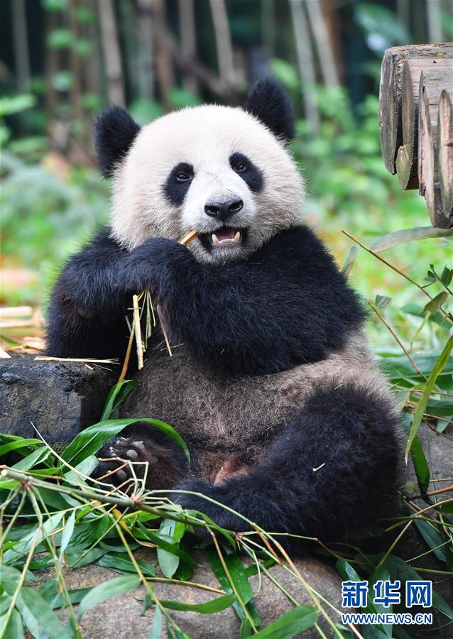 5月27日,大熊貓婷仔在享受竹子大餐。正在享受竹子大餐的廣州長隆野生動物世界大熊貓婷仔被大熊貓隆仔搶食,兩只大熊貓上演一場爭食戲碼。新華社記者劉大偉攝