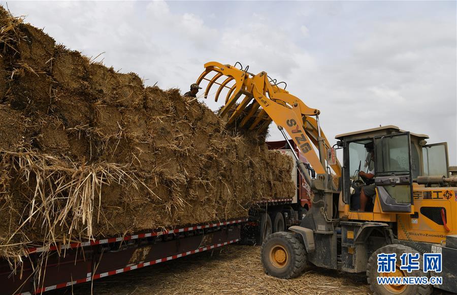 5月20日,在新疆博湖縣西南河口葦場(chǎng),工人將打包成捆的蘆葦裝車。新華社記者宋彥樺攝