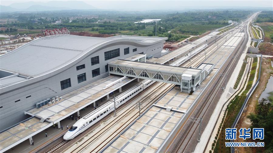 5月27日,試運行檢查確認列車??吭谏毯虾几哞F安吉站(無人機照片)。新華社記者張端攝